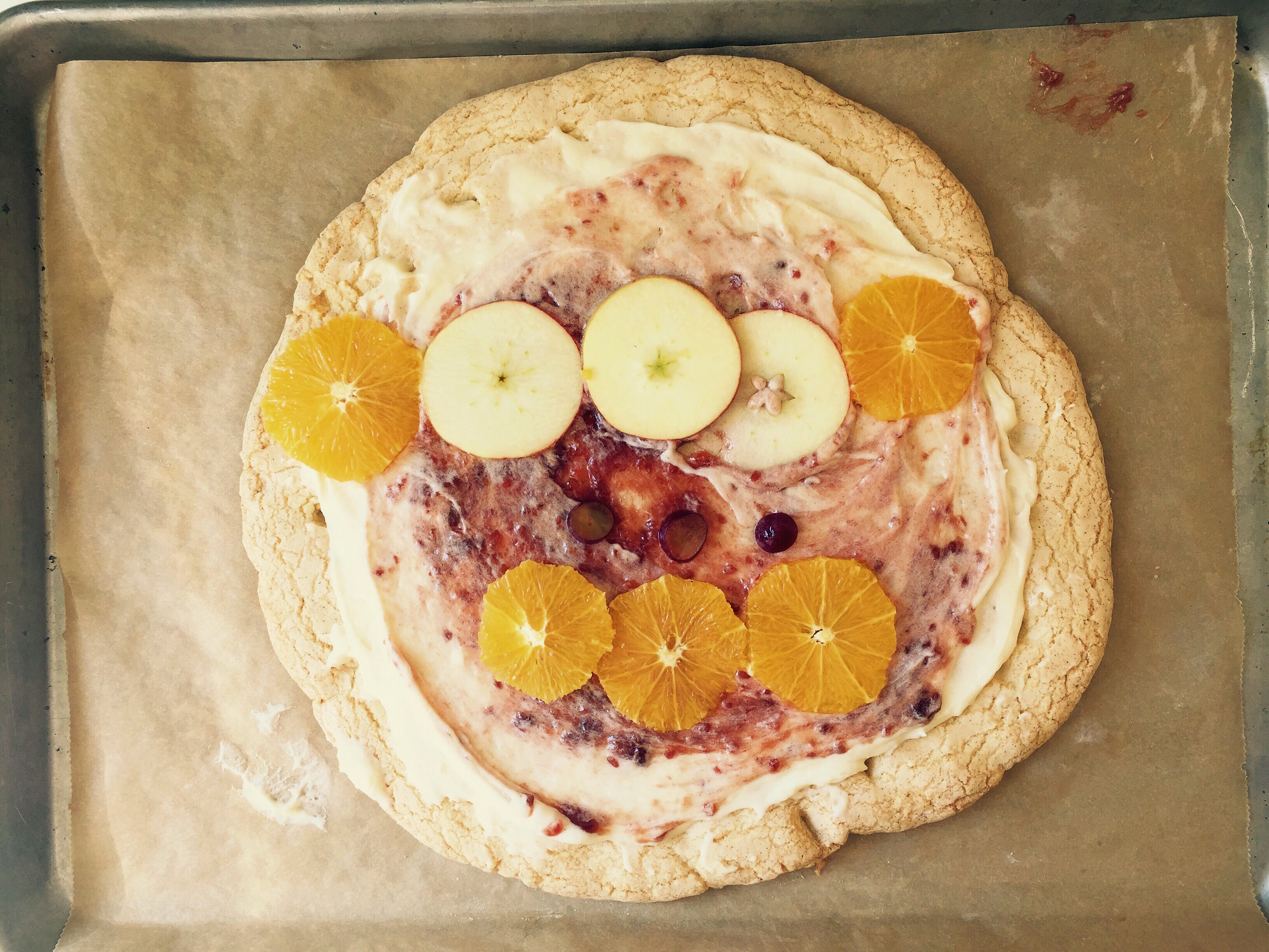 Sugar Cookie Pizza. Henry and I spent the whole morning playing restaurant. He drew up some menus, with items including a wild blueberry salad, a fruit risotto for dessert, and a fruit pizza. Lots of fruit. It made me want to make a real fruit dessert pizza, so we did. Baking with kids is an exercise in patience and mindfulness for me. It is mostly not at all fun. I like to do things my way. It physically hurt me to watch Henry try to spread cream cheese frosting (leftover from Helen’s cupcakes!) on the cookie. I was so happy when he asked me to do it. This process repeated exactly with the raspberry jam. And the decorating! That’s not how I wanted to decorate the cookie pizza! I know, I can hear myself. Who cares how your kid decorates a cookie pizza, you nutbag! Well, I do. I wish I didn’t but I really do. I try not to let it show, but I’ve got just about the worst poker face so he’s going to catch on one of these days. Oh me.
