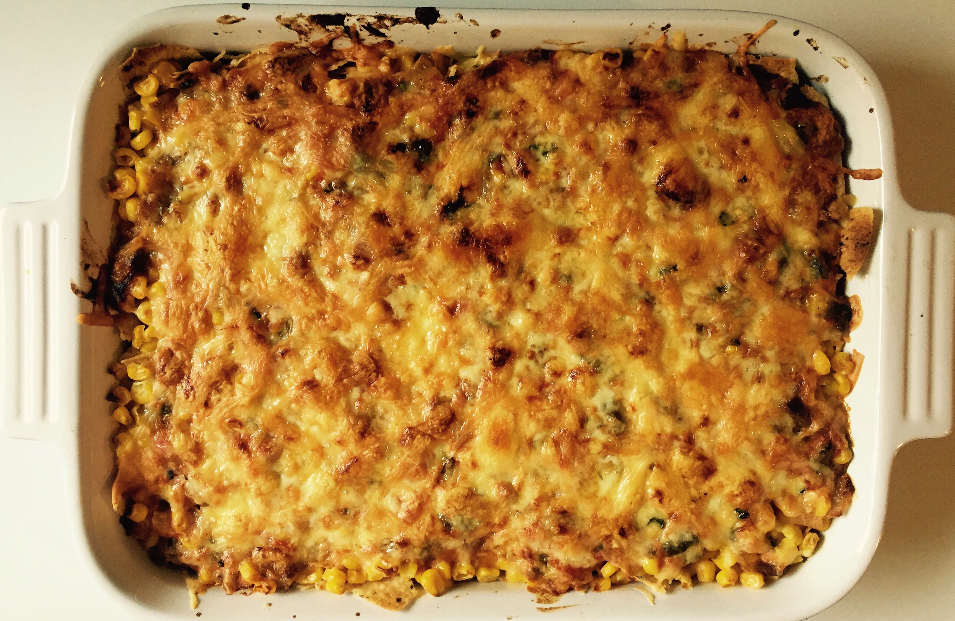 Vegetarian King Ranch Casserole. I had to make something out of beans leftover from Helen’s burrito bar dinner, a half bag of frozen corn, and the broken shards at the bottom of two bags of tortilla chips. King ranch casserole, y’all. I used bean water instead of stock, frozen hatch chiles instead of poblano, a layer of beans, and a layer of corn instead of the chicken. It was not as good as the real thing but pretty good for something made out of a ton of odds and ends.