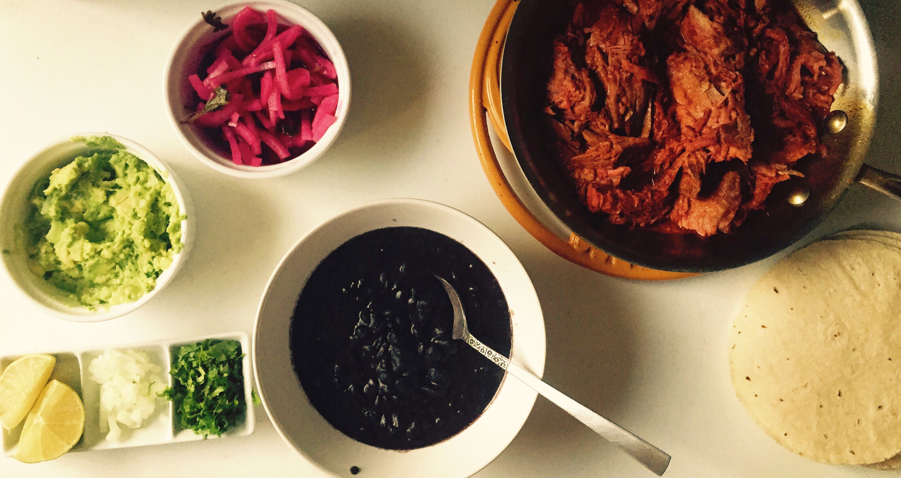 Cochinita Pibil, Black Beans, Guacamole. This day had all the things. Stunning highs (this dinner), shameful lows (you’ll see), and a drab visit to the dentist too. George had a dentist appointment at 11:15, so at precisely the moment I had planned to get in the car he decided he had to poop, which is an ordeal I won’t go into, but it took time to get through it. I got the kids in the car and pushed the garage door button and it went up about two feet and stopped. I tried it 14 more times to make sure, and it didn’t work any of them, so I had to figure out how to open it manually. For anyone who has done this, you know that it is as easy as pulling a cord and then lifting up, which is to say, very easy. But I pulled the cord over and over and nothing happened. This isn’t the shameful low, if you’re wondering. This is just to help you feel the general tone of the day. I eventually got the garage door open and we left and were late to the dentist and it was all ok in the end. After the dentist, we swung by my friend Abbie’s house (she of the food52 taco party fame from last week’s post) and she gave me ALL HER LEFTOVERS because she was going out of town, which if it were any other person’s leftovers wouldn’t be exciting, but because they were ABBIE LEFTOVERS it was all-caps-level-exciting. I got the rest of her cochinita pibil (my favorite!), her gorgeous pickled onions, tortillas, and the most fabulous Cracker Jill (I need to find a recipe for this- it was like cracker jack except a little spicy from sriracha and a lot more delicious from bacon lardons) and Spicy Pimento Cheese leftover from the talented Mrs. Wheelbarrow. The kids and I killed half the bag of cracker jill before we got home. Then we had to go to parkour class, but right before we were about to leave George fell asleep on me. I woke him up and told him that we had to go and he could sleep in the car on the way to class but it was too late- he was inconsolable and screamed, really screamed, the whole drive until finally passing out as I turned into the parking lot. He slept through Henry’s class, and then woke up and wanted milk when Henry was done, so we all headed over to the active play room, and I nursed George in the windowless snack room while Henry played on the equipment in the main room. Henry would come in every few minutes to check in with me. The room smelled strongly of some sort of febreeze-y scent and Henry said “It smells fresh in here. Like air cake.” I liked it! He ran back out to play and a few minutes later a kindly lady holding a little baby came up to me and said “Is the boy in the blue shirt your son?” I nodded, fearfully. “He’s grabbing other kids…” she trailed off as I unlatched George and tried to (gracefully?) slip my boob back into my shirt so I could go out and fetch Henry. “I can tell he’s really excited to be here,” she added diplomatically. I was really embarrassed. Turns out Henry was hangry. I only had pretzel rods with me so he ate 5 of them and then we tried the play room again. Constant vigilance this time and the rest of the afternoon went ok. I’m gonna do better on the snacks this week, and just nurse George in the big open room because who cares. It was so nice, so really and truly wonderful, to get to just reheat the cochinita pibil in a pan and be done with dinner.