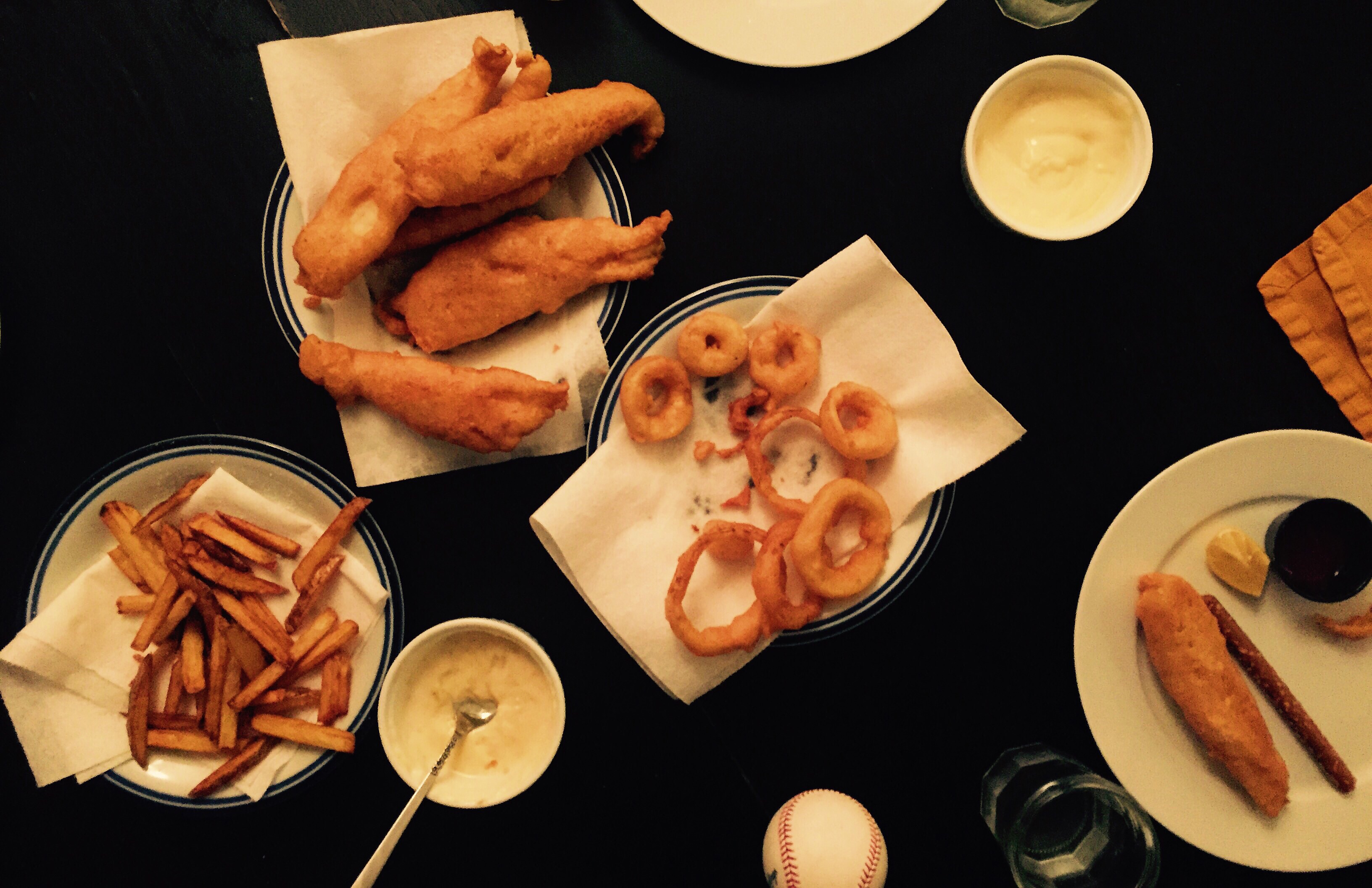 Beer-Battered Fish, French Fries, Onion Rings, Homemade Mayo & Tartar Sauce. George has been sleeping badly, which means I have been too, but in spite of that, he woke up in a great mood. I still had my eyes closed when he said, “Let’s do something else. Let’s throw a baseball up in the air.” I like that the baseball somehow ended up on the table at dinner that night. I’d been craving fish and chips for a while, and I had two tiny russet potatoes in the pantry and fish and a single beer in the fridge, but I didn’t have enough oil to fry all the things I wanted to fry. So we walked around the block to the Mexican grocery store near our house to pick up some more. We can’t go there without getting paletas and every time (every time!) the kids pick out the worst flavors. George got a baby blue bubble-gum flavored one that had two shiny gumballs shoved into the undercarriage of the thing. Henry got something yellow and tubular with the label “rompope” on it, which means nothing to me. It was an icy vanilla nightmare. Why yellow? I don’t know. But the kids ate them on the walk back to the house as the wind picked up and blew leaves off the trees in swirls around us. I had tons of leftover batter after frying the fish and used it to batter onion rings, which Henry went wild for. The fries were thrillingly good. The fish was ok.