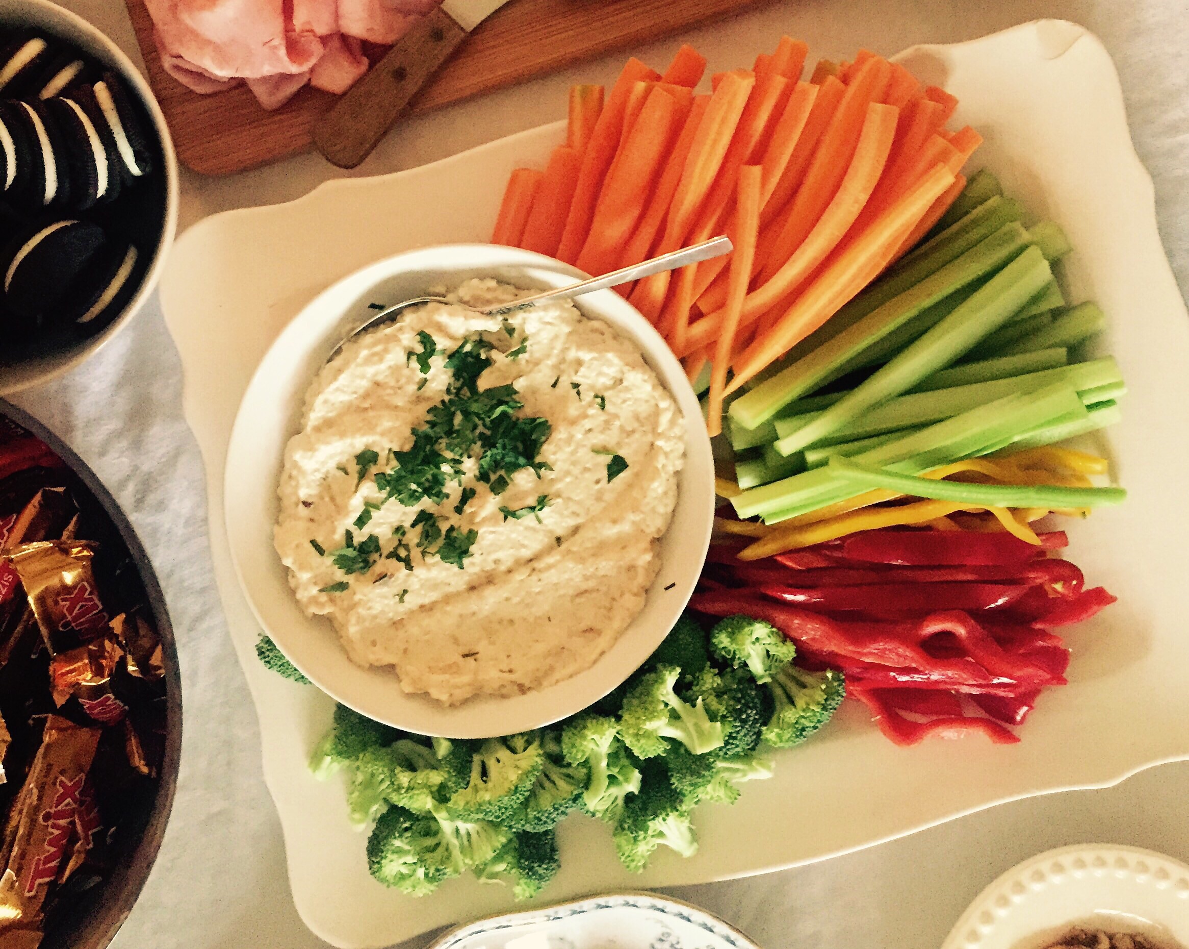 Caramelized Onion Dip, Crudite. I made half the recipe for this dip and it was plenty. No way was I going to chop up five pounds of onions for a dip. Everyone loved it!