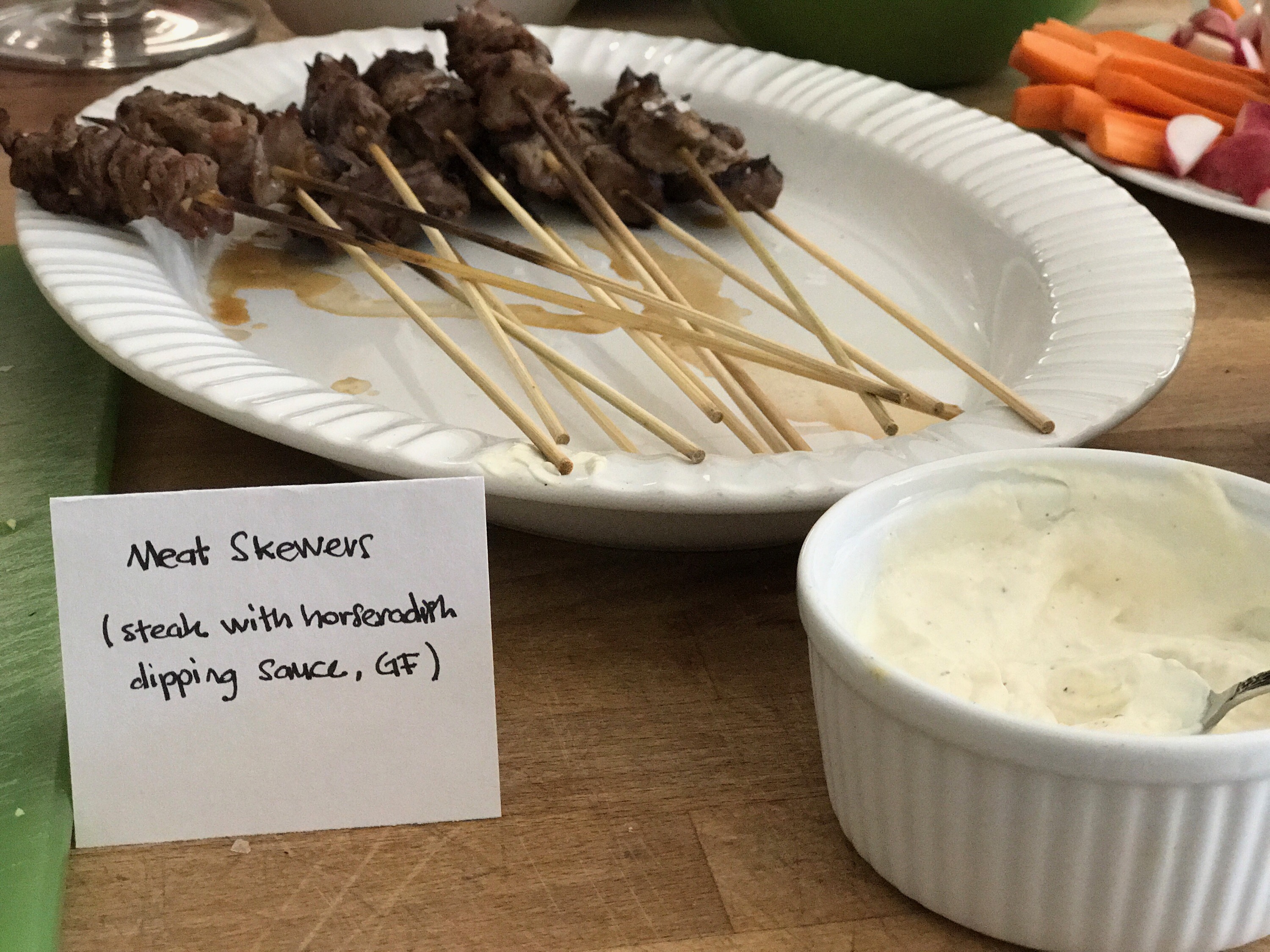 Herbed Beef Skewers with Horseradish Cream. Link eats meat skewers and mushroom skewers in the game, so we had both.