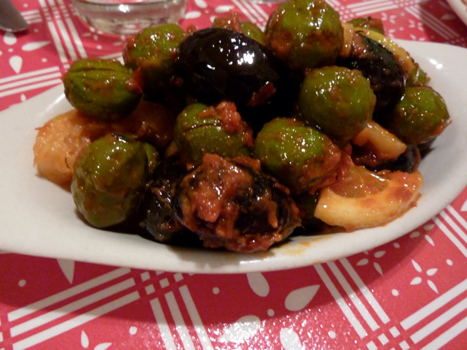 Also on the table were some really tasty olives, marinated in a beautiful tomato sauce, complete with thin slices of lemon. What fun!