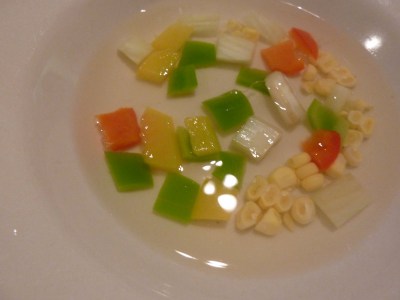 Next we had a really crazy palate-cleanser course. Though it looks really tame, this was packed with flavor- the clear broth is actually a pepper consomme of sorts, with a clean crisp jalapeno-y flavor.