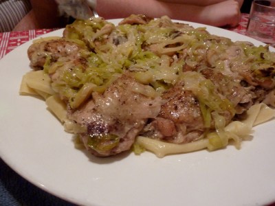 Our main course was another high point of the meal. Chicken thighs, browned and braised with a ton of leeks, wine, and butter on top of homemade pappardelle . It was a simple dish executed perfectly.