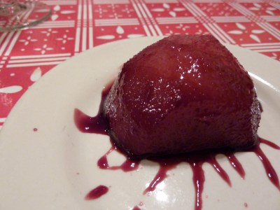 And that takes us to the last dish, which the chef informed us was a happy accident. We were supposed to be served some fairly standard wine-poached pears, but he had put them in the freezer to cool off slightly and forgotten about them. He was afraid he had ruined the dessert, but then tasted it and found out that slightly-frozen poached pears are awesome! We all agreed- the texture was smooth and icy, and the flavor was amazing.