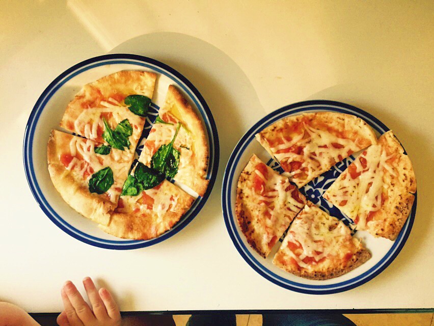 Pita Bread Pizzas. I’m a woman obsessed. We made these to satisfy George’s lunchtime pizza craving, and I can’t stop thinking about them. I preheated the oven to 350 and put two thin Phoenicia pita rounds on a baking sheet. The kids spooned crushed tomatoes on them, sprinkled them with low-moisture mozzarella, and I drizzled them with olive oil and salt. We gave ’em about five minutes in the oven to stiffen up, and then I broiled the tops to get the cheese nice and bubbly. They are a little floppy but taste like the greasy takeout pizza of your dreams. Do you roll your eyes whenever my kids fingers are in the shot? I can’t help including it- I think their big pancake hands are adorable.