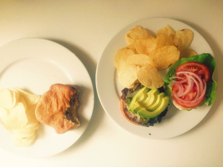 Ultra-Smashed Cheeseburgers, Regular and Ron Swanson-Style. Andy graciously let me carry away his plate to photograph alongside mine because I loved the juxtaposition. Andy and I are opposites in almost every way. I think our brains are also the opposite of our preferred burgers. Andy’s got neurons firing every which way, solving complex math problems and logic-ing out computer programs and mine is whistling softly, thinking about jalapeno pepperoni pizzas.