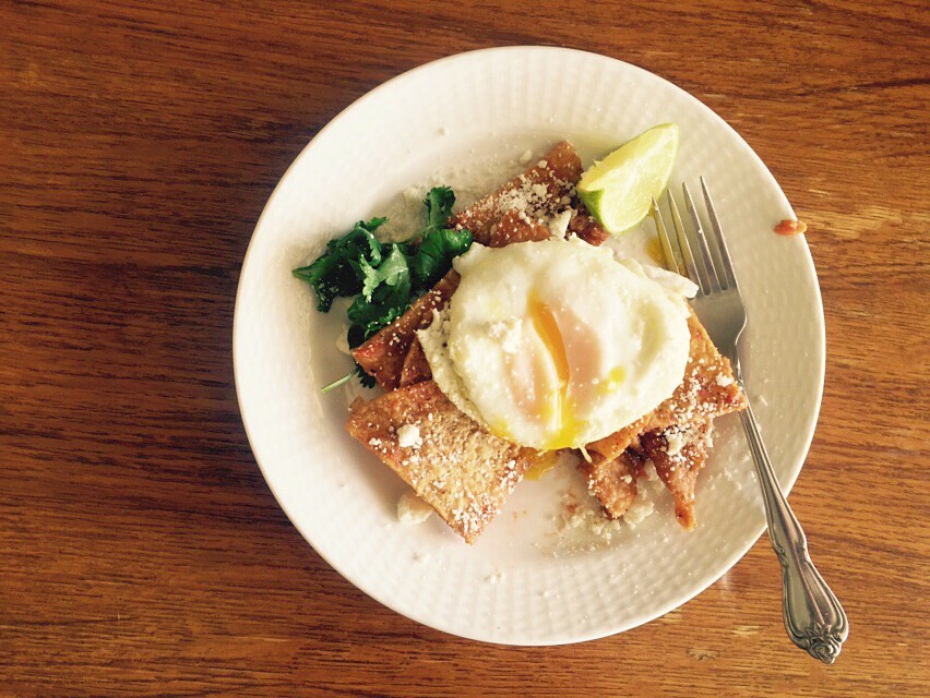 Chilaquiles with a Fried Egg. Our first breakfast at the beach! The recipe is for vegan chilaquiles but I cooked these in bacon grease because I am a rebel; dangerous and black-hearted.