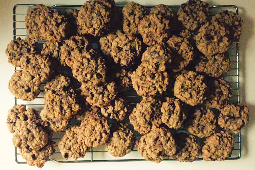 Oatmeal Chocolate Chip Cookies. How many weeks in a row will my post include a massive pile of cookies? There’s a possibility that this might be week four of my late-summer cookie bender. I really have to reign things in. I made these for the beach and we snacked on them on the way down there and still had some left for the way back. There are even a few stale, large-ish crumbs in a greasy chocolate-smeared ziploc bag on the counter next to me right now (five days later) because I’m not ready to say that I wouldn’t eat them. In an effort to not eat more cookies, or what’s left of them, after dinner tonight I put a dollop of peanut butter and a sprinkle of sea salt on top of a square of dark chocolate. Then I ate three more. I felt pretty good about my healthy choices.