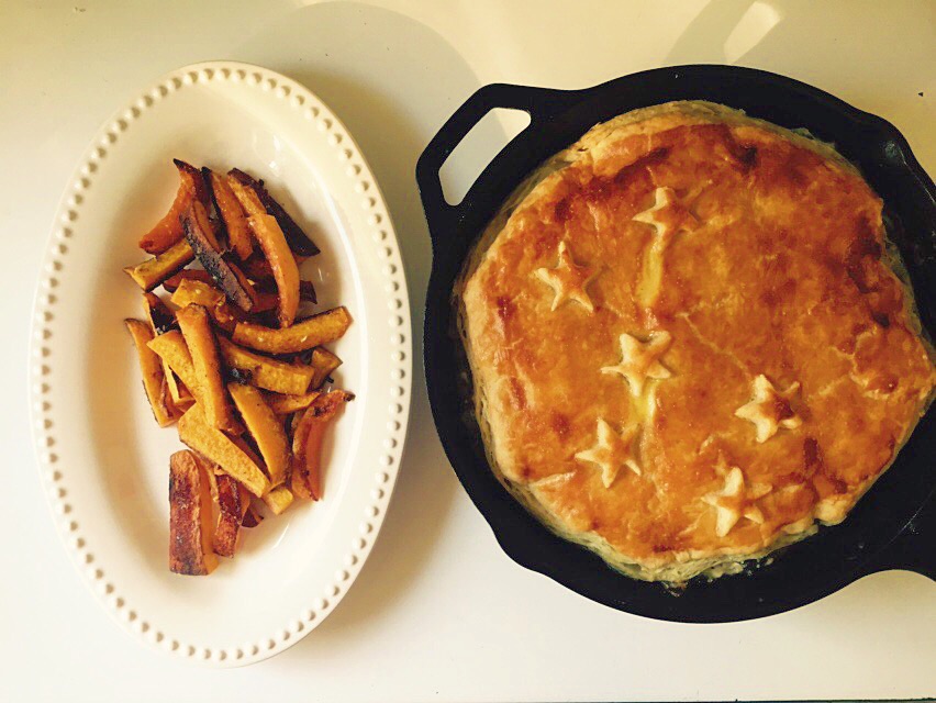 Spanikopita-ish Pie, Butternut Squash Wedges. I did weird things to this recipe, replacements all over the place- aging chard and kale blanched and drained instead of the spinach, feta instead of gouda, and I only had one piece of puff pastry so I just put it on top. Everything came out a weird greyish color- from the cast iron? I have no idea. It tasted pretty good though. The butternut wedges were tossed in coconut oil and minced garlic and kosher salt and were so great. Penis. I’ve been wondering if people skip over the paragraphs when I straight talk about how I cooked something, so this is a little test. Except it’s maybe a bad one because maybe you do skip over those paragraphs but your eyes are magnetically drawn to the word penis, so you read this paragraph when you normally wouldn’t have. I should add another line here that doesn’t say the p word so those two p-words are buried in the meat of this paragraph and are therefore more likely to be scanned-over by the casual reader. This is real. This is science.